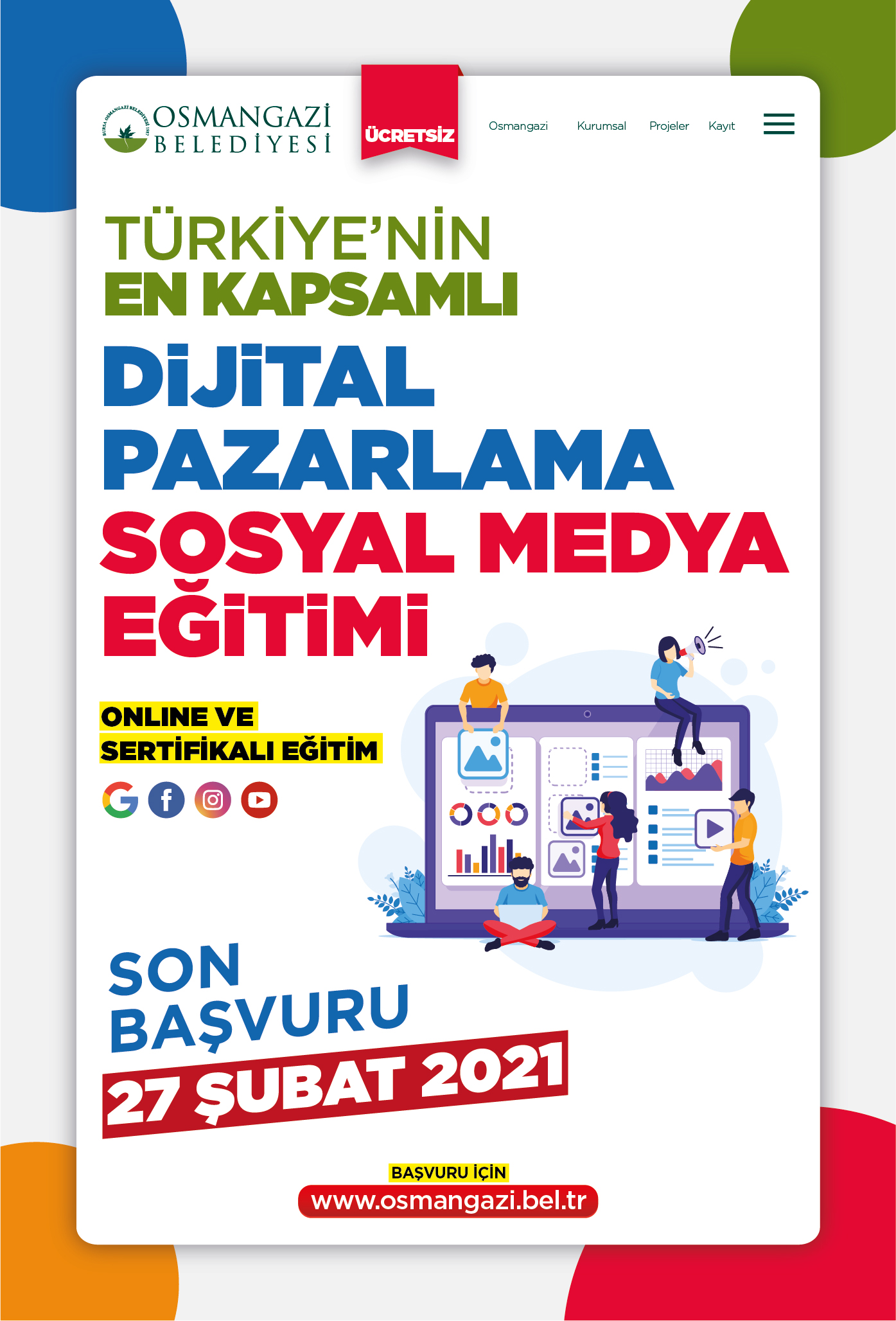 Özgür Deniz Aydın, Sezgi Karabaş ve Furkan Acarel gibi alanında önemli isimlerin katılacağı Dijital Pazarlama ve Sosyal Medya Eğitimi, 5 hafta sonu 48 saat sürecek. Şubat ayı sonunda başlayacak eğitim sonunda kursiyerler sertifika sahibi olacak. Eğitime katılmak isteyenlerin http://osmangazi.bel.tr/tr/kurumsal/dijital-pazarlama-egitimi-basvuru-formu adresindeki formu doldurması gerekiyor.