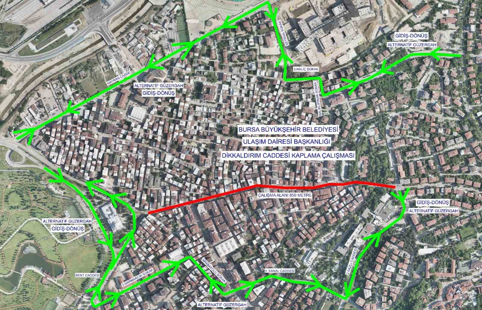 “Asfalt yenileme çalışmaları çerçevesinde merkez Osmangazi ilçesi Dikkaldırım Caddesi, 25 Eylül Pazartesi günü saat 22.00 ile 27 Eylül Çarşamba saat 06.30 arasında trafiğe kapatılacaktır. 3 gün sürecek çalışma çerçevesinde, cadde her gün aynı saatlerde trafiğe kapatılacak ve ulaşım alternatif güzergahlardan sağlanacaktır.”