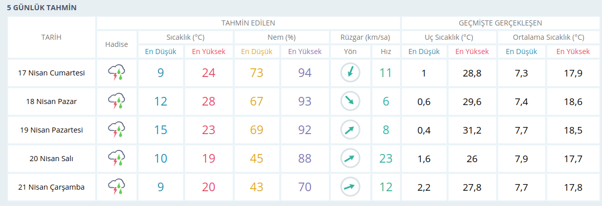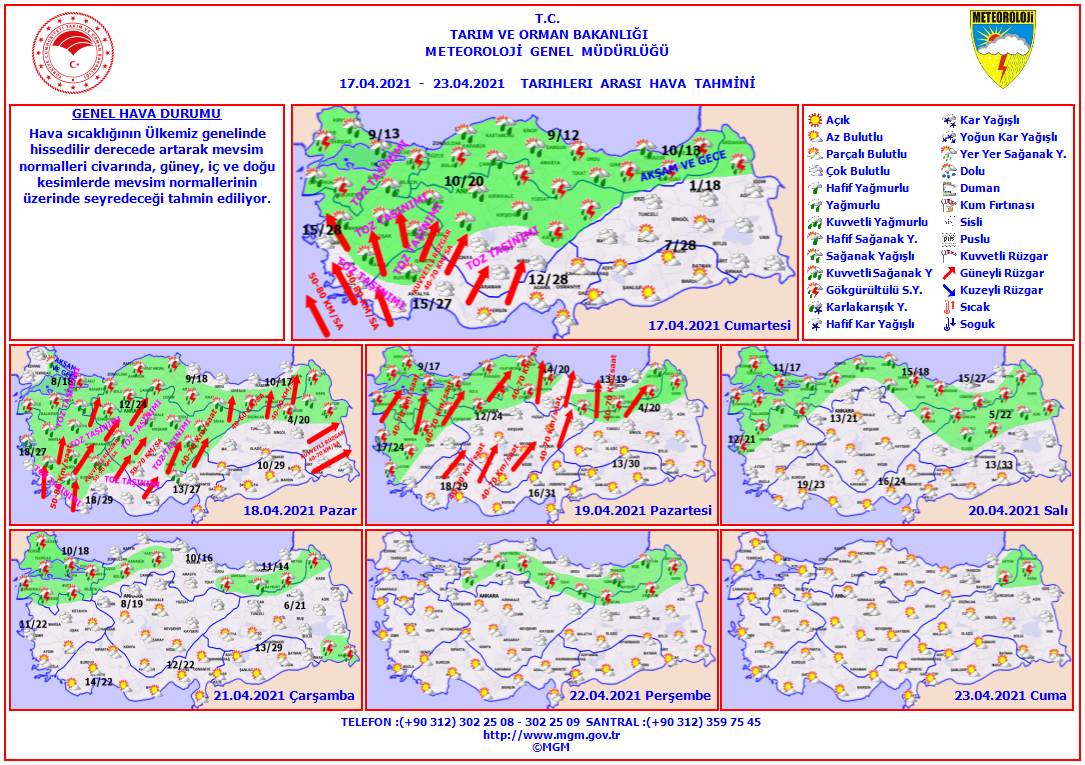 Haftalık Hava Durumu (17 – 23 Nisan 2021) Hava sıcaklıklarının Ülkemiz genelinde hissedilir derecede artarak mevsim normalleri civarında, güney, iç ve doğu kesimlerde mevsim normallerinin üzerinde seyredeceği tahmin ediliyor.