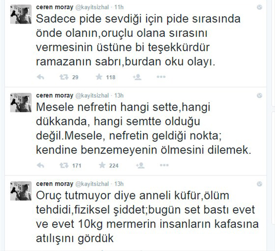 Moray, ‘Oruç tutmuyor diye anneli küfür, ölüm tehdidi, fiziksel şiddet; bugün set bastı’ derken, saldırının kendi setlerinde mi yoksa başka bir sette mi olduğuna dair ayrıntı vermedi.