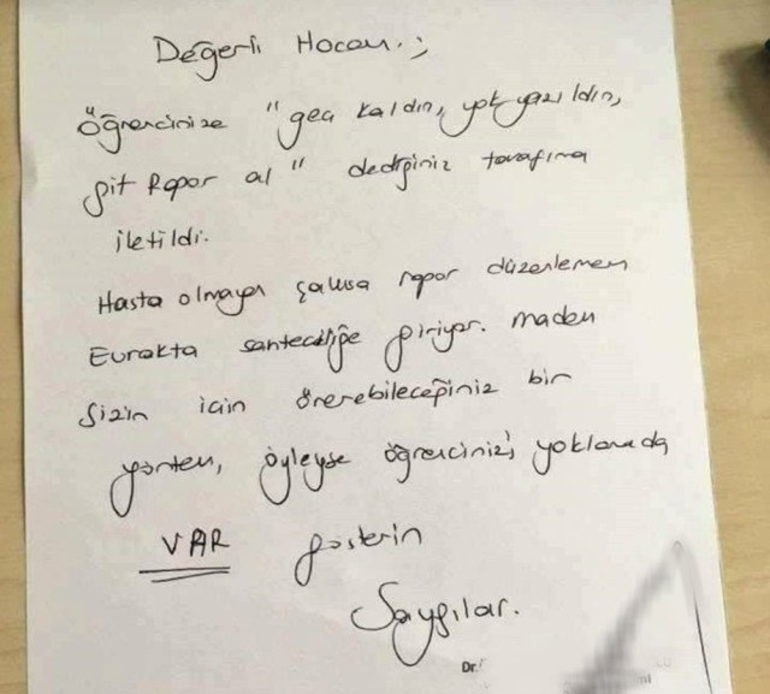 Cevapta, “Değerli hocam; öğrencinize ‘geç kaldın, yok yazıldın, git rapor al’ dediğiniz tarafıma iletildi. Hasta olmayan şahsa rapor düzenlemem evrakta sahteciliğe giriyor. Madem sizin için önerebileceğiniz bir yöntem, öyleyse öğrencinizi yoklamada VAR gösterin. Saygılar” denildi.