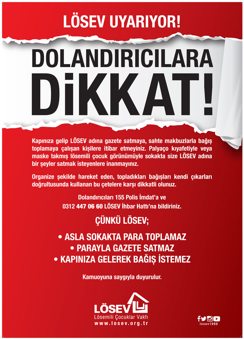 Dolandırıcıların son yöntemi görenleri şaşırttı. Kimi zaman dergi satan, sahte kimlik gösteren dolandırıcılar, sahte makbuz ile bağış toplamaya; kimi zaman saçlarını kazıtıp, maske takıp lösemili çocuk görüntüsü ile duygu sömürüsü yapmaya başladı. Türkiye’nin çeşitli bölgelerinden gelen ihbarları değerlendiren LÖSEV, ihbar sahiplerini kolluk güçlerine yönlendirirken, hukuki mücadelesini de sürdürüyor. Bunların yanı sıra LÖSEV adını kullananlara karşı da kamuoyunu uyarıyor: “LÖSEV asla sokakta para toplamaz, parayla gazete ve dergi satmaz, kapınıza gelerek bağış istemez.” Tüm gönüllü ve bağışçılarına çağrıda bulunan LÖSEV’e göre en etkili mücadele yöntemi çocukların sağlığına göz diken hırsızlar hakkında herkesin bilgi sahibi olması.
