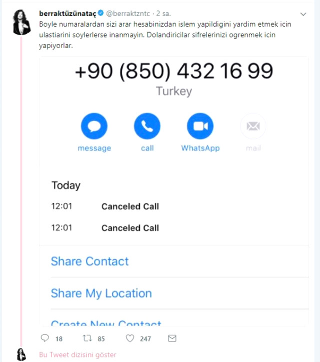 33 yaşındaki oyuncu Berrak Tüzünataç, ülkemizde sıklıkla rastlanan telefon dolandırıcılığa karşı takipçilerini uyardı.