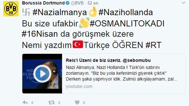Dortmund hesabının hacklenmesinin ardından atılan ilk tweette Almanya ve Hollanda’nın Türkiye’ye karşı tutumu ve faşist politikaları eleştirildi. Mesaj 10 dakika yayında kaldıktan sonra hesaptan kaldırıldı.