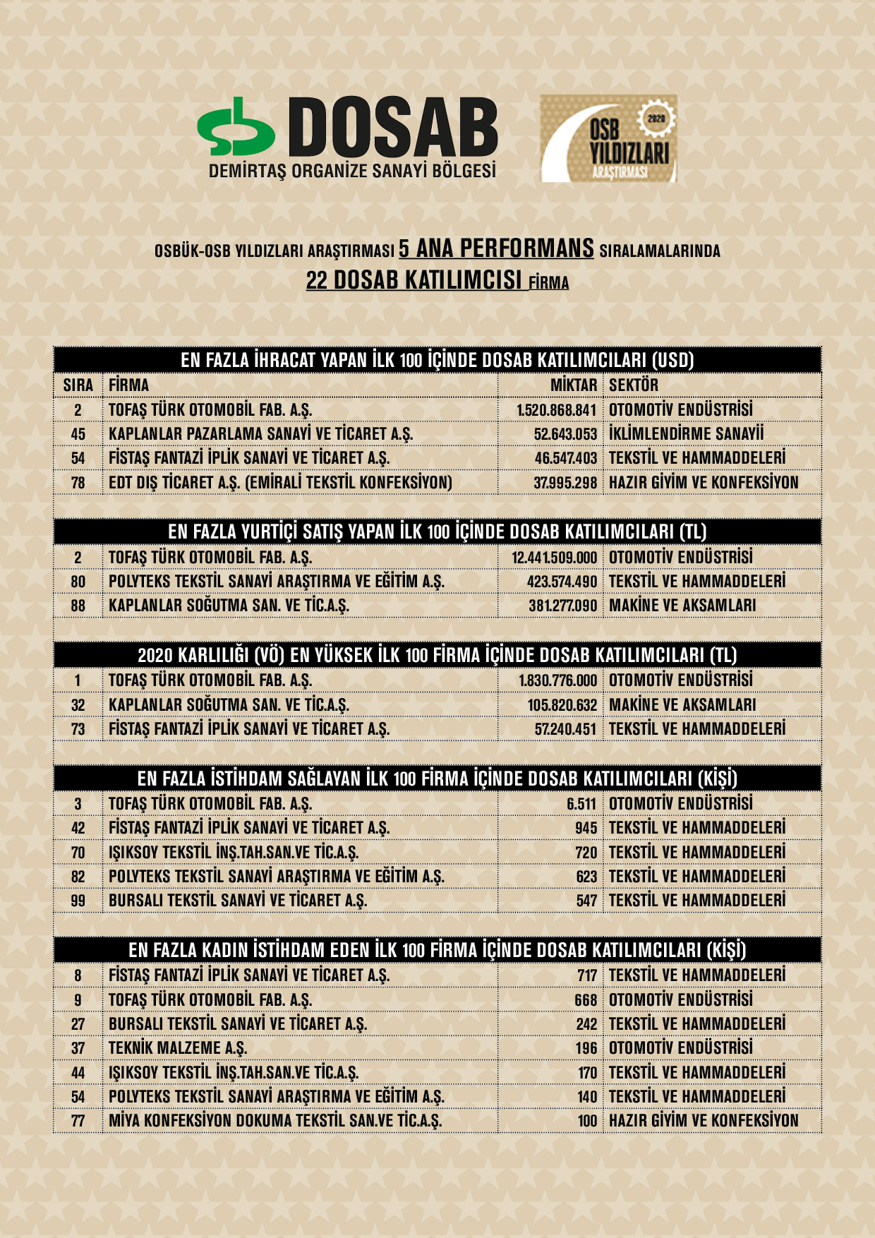 DOSAB katılımcısı 11 firma, 5 ana ve 5 yan performansın 35 sıralamasında yer aldı. Tofaş Türk Otomobil Fabrikaları AŞ, Kaplanlar Soğutma AŞ, Kaplanlar Pazarlama AŞ, Fistaş Fantazi İplik AŞ, Polyteks Tekstil Sanayi Araştırma ve Eğitim AŞ, EDT Dış Ticaret AŞ (Emirali Konfeksiyon), Bursalı Tekstil AŞ, Işıksoy Tekstil AŞ, Teknik Malzeme AŞ, Miya Konfeksiyon Tekstil Dokuma AŞ, Maysan Mando Otomotiv Parçaları AŞ, OSB Yıldızları arasına 35 kez adlarını yazdırdılar. Tofaş, karlılık, en fazla yatırım yapan ve Ar-Ge’ye en fazla harcama yapan firma kategorilerinde ilk sırada, en fazla ihracatta ikinci sırada yer alırken, hemen tüm kategorilerde sıralamaya girdi.