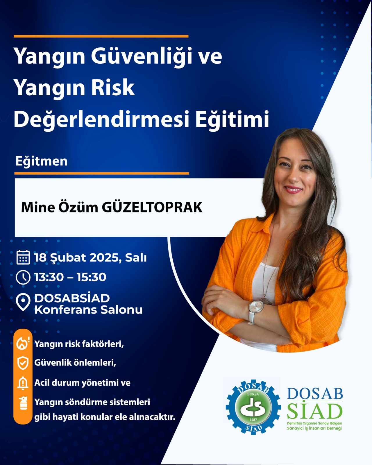 Demirtaş Organize Sanayi Bölgesi Sanayici İş İnsanları Derneği (DOSABSİAD), sanayi tesislerinde güvenliğin artırılması ve olası risklerin minimize edilmesi amacıyla 18 Şubat 2025 Salı günü, “Yangın Güvenliği ve Yangın Risk Değerlendirmesi Eğitimi” düzenleyerek firmaları bilinçlendirecek. Eğitim, yangın risklerinin tespiti, alınması gereken önleyici tedbirler ve acil durum yönetimi gibi kritik konuları içerecek. HSE Akademi’den Mine Özüm Güzeltoprak tarafından verilecek eğitimde, sanayi tesislerinde sık karşılaşılan yangın sebepleri ve en güncel yangın güvenliği uygulamaları ele alınacak.
