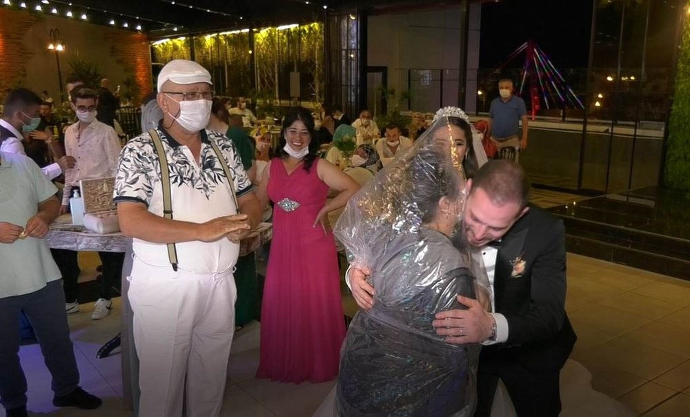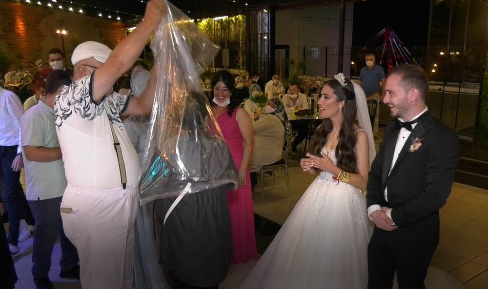 Altan Yücebaş, “Gelin ve damat çok yakın akrabamız. Bizi çok seviyorlar. Ben de, eşim de kronik hasta olduğumuz için insanlarla çok yakınlaşamıyoruz. Ben hiçbiriyle kucaklaşmıyorum ama eşimi çok seviyorlar. Takılarını taktık mecburen. Eşimi kucaklaşmak istediğini fark ettim. Sordum geline, ‘Kucaklamak mı istiyorsun’ diye sordum. ’Evet’ dedi. Ben de kucakla dedim. Poşeti çıkartıp hemen eşimin kafasına geçirdim ve kucaklaşmalarını sağladım. Düğün için hoş bir şey oldu. Corona’dan korunalım diye bu farkındalığı yapmak istedim” dedi.