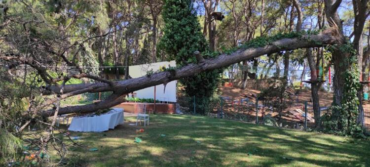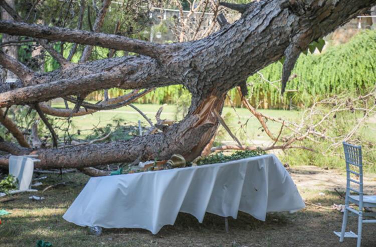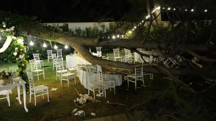 Düğünde, henüz belirlenemeyen nedenle alandaki yaklaşık 15 metre uzunluğundaki çam ağacı, misafirlerin bulunduğu masaların üzerine devrildi.