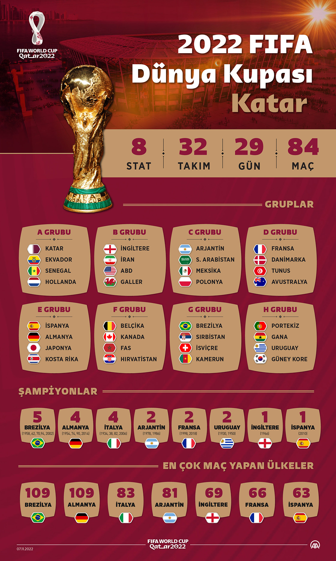 2022 Dünya Kupası’nın ev sahibi Katar, turnuvada ilk kez boy gösterecek. Katar’ın katılımıyla bu sayı 80’e yükselecek.