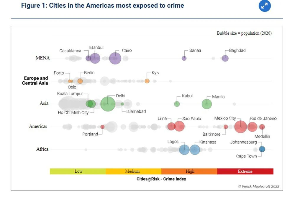 Bununla birlikte, suç (cinayetler, hırsızlık ve maddi hasar gibi), terörizm, sivil huzursuzluk ve çatışmalarla ilgili verileri kullanan çalışma, olası en kötü puanı alan 12 şehirden 8’inin Latin Amerika’da olduğunu buldu.