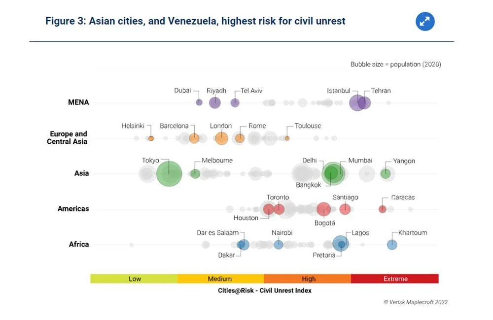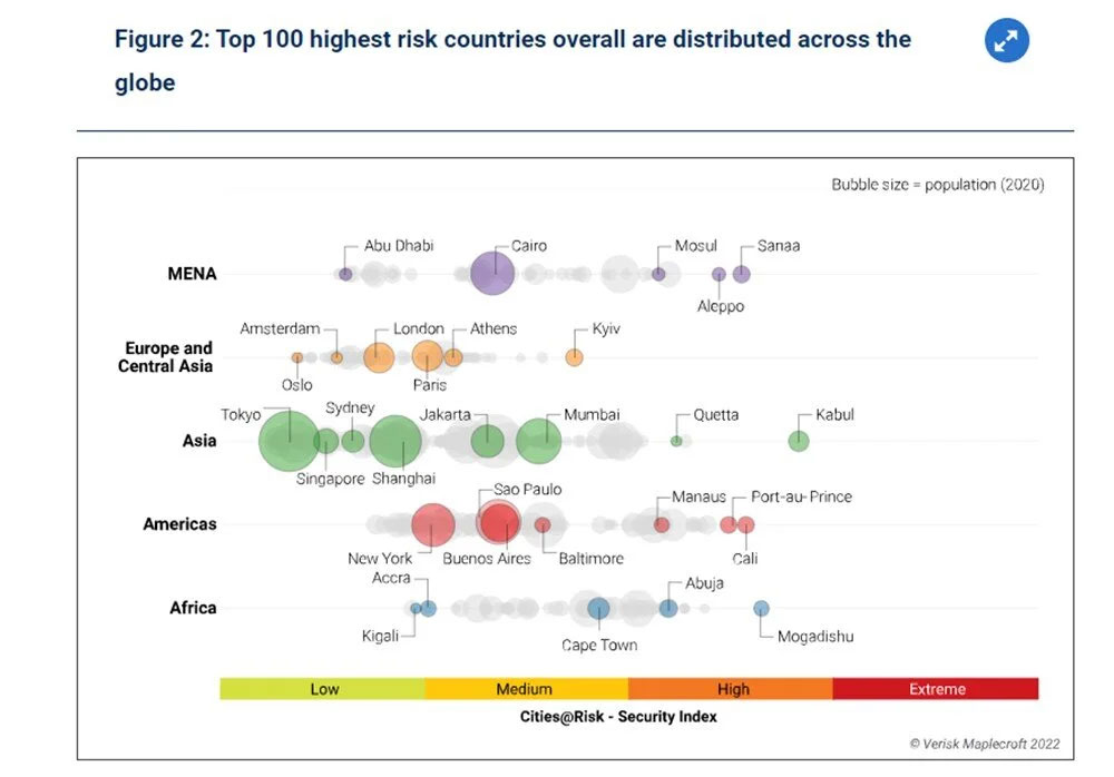 Diğer taraftan, Kolombiya’nın başkenti Bogotá, Verisk Maplecroft tarafından Brezilya’daki Rio de Janeiro ve Mexico City ile birlikte dünyanın en büyük 30 şehri arasında en riskli üç şehirden biri olarak gösterildi.