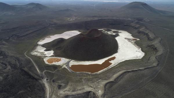 Yeraltı su kaynaklarından beslenen ve suyu tuzlu olan Meke’nin ortasında, 50 metre yükseklikte volkan konisi bulunuyor.