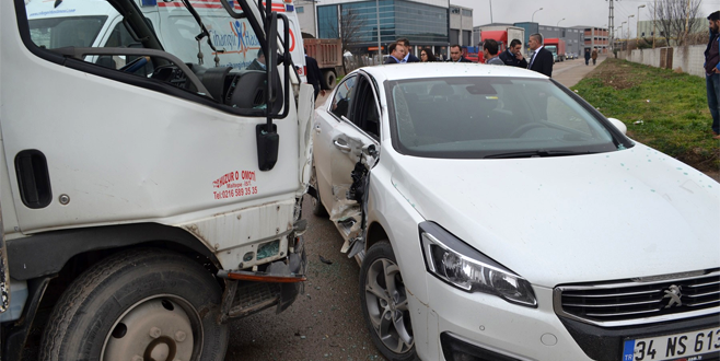 Öte yandan, Organize Sanayi Bölgesi 1. Cadde üzerinde seyir halinde olan Süleyman T. yönetimindeki 16 KHM 19 kamyonet ile aynı cadde üzerinde seyir halinde olan Ekrem A. yönetimindeki 34 NS 6131 plakalı özel otomobil çarpıştı. Kaza sonucunda şans eseri yaralanan olmazken, araçlarda maddi hasar meydana geldi.