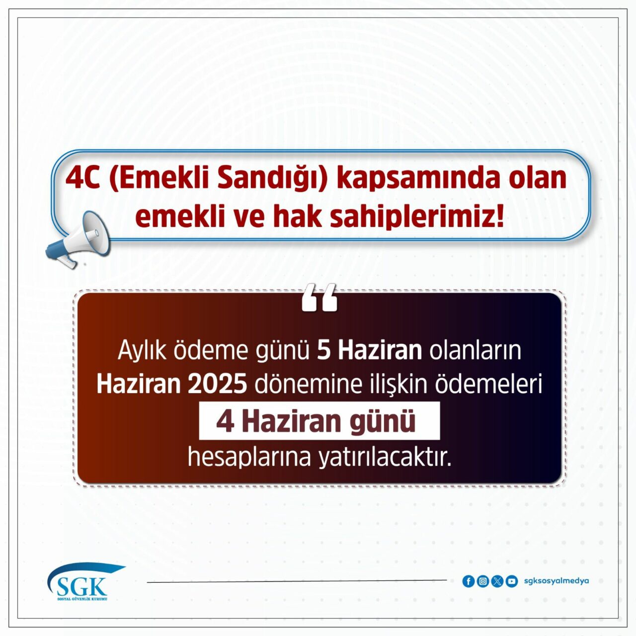 “Aylık ödeme günü 5 Haziran olan 4C (Emekli Sandığı) kapsamındaki emekli ve hak sahiplerimizin Haziran 2025 dönemine ilişkin aylık ödemeleri öne çekilerek 4 Haziran 2025 tarihinde hesaplara yatırılacaktır.”