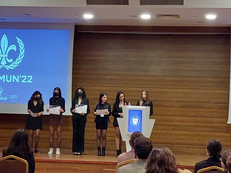 Konferansın kapanış töreninde aldıkları ödüllerle farklarını bir kez daha gösterdiler. Katılımcı öğrencilerden Duru Karalar ve İrem Demir “Outstanding Delegate (Seçkin Delege), Ceren Çaçar ise “Honarable Mension” (Mansiyon Ödülü) ödüllerini aldılar.