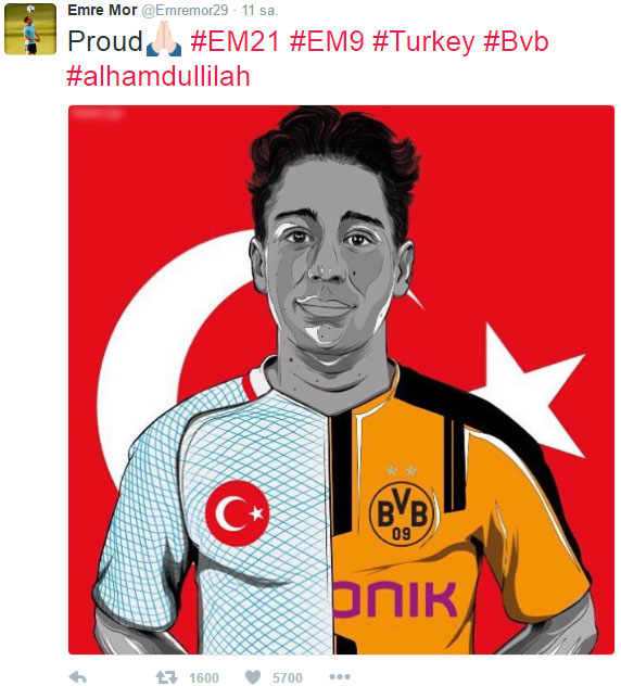 2016 Avrupa Futbol Şampiyonası’nda oynadığı futbolla dikkatleri üzerine çekmeye başaran genç yıldız Emre Mor kişisel Twitter hesabından Türk Milli Takımı ve yeni transfer olduğu Borussia Dortmund formalarının yarı yarıya yer aldığı bir görsel paylaştı.