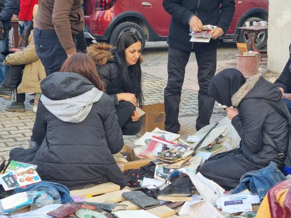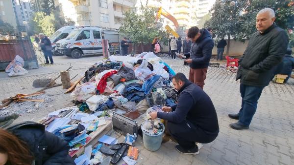 Enkaz altında kalan yakınlarından gelecek umutlu bir haber bekleyenler, bir yandan da eşyaların arasında onlara ait olan malzemeleri arıyor.