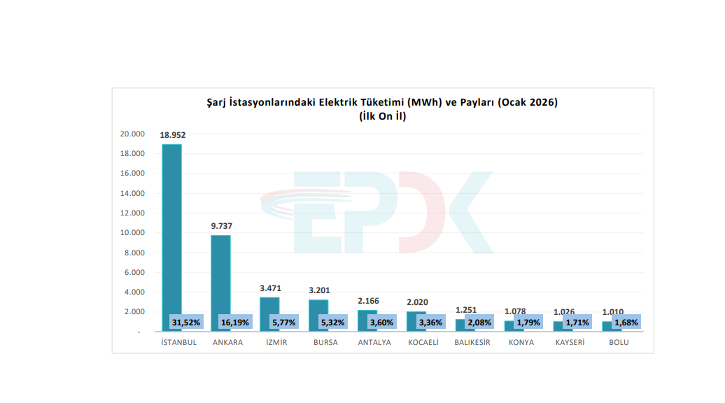 Ocakta şarj istasyonlarının elektrik tüketimi 60 milyon 124 bin 282 kilovatsaat oldu. Bunun yüzde 60,6’sına denk gelen 36 milyon 415 bin 202 kilovatsaatlik kısmı yeşil şarj istasyonlarından karşılanırken, 23 milyon 709 bin 80 kilovatsaatlik tüketim ise diğer istasyonlardan sağlandı.
