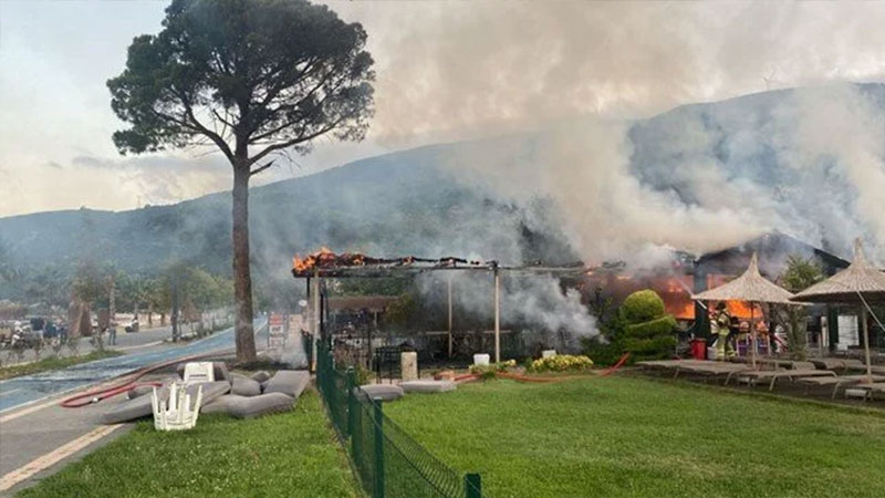 Balıkesir’in Erdek ilçesi Ocaklar Mahallesi’nde bulunan bir otelin bahçesindeki bar ve havuz bölümünde saat 05.30 sıralarında yangın çıktı.