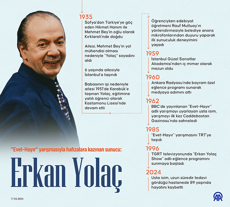 Erkan Yolaç, 1960’ta Ankara Radyosunda bayram özel eğlence programını sunarak medyaya adımını attı. BBC’de yayınlanan “Evet-Hayır” adlı yarışmayı uyarlayan usta isim, yarışmayı ilk kez 1962’de Caddebostan Gazinosu’nda sahneledi.