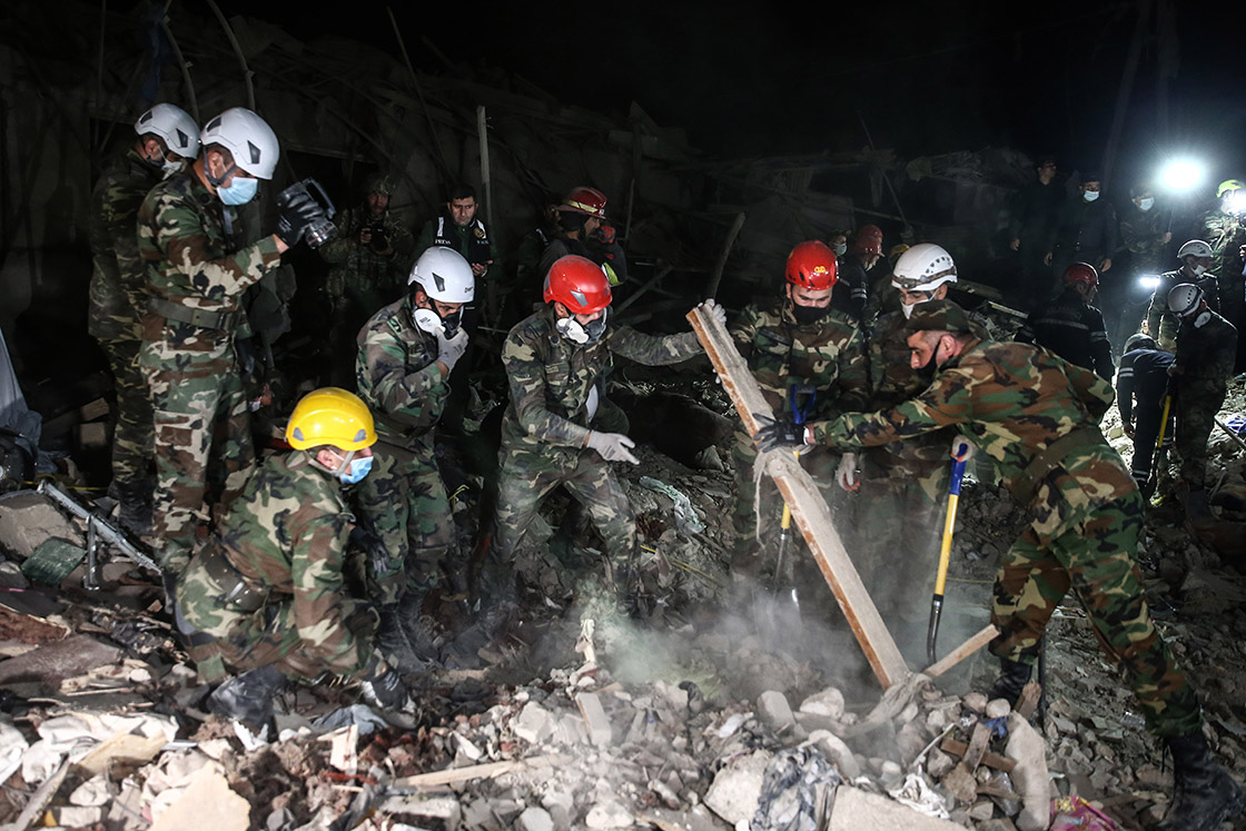 Olay yerinden alınan bilgiye göre, Gence’de enkaz alanında arama kurtarma çalışmaları devam ediyor.