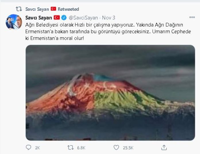 Ağrı Belediye Başkanı Savcı Sayan, sosyal medya hesabından Ağrı Dağı’na resmedilmiş Türkiye ve Azerbaycan bayraklarının yer aldığı paylaşımla Ağrı Belediyesi olarak dağda Türk ve Azeri bayraklarının yer alacağı projesini duyurdu.