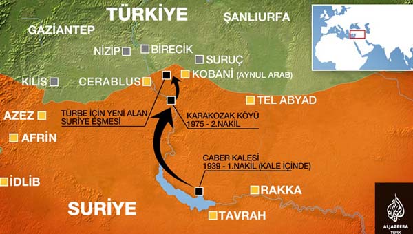 Süleyman Şah Türbesi’nin nakledileceği ‘Suriye Eşmesi’ olarak açıklanan köy Türkiye sınırına kuş uçuşu 500 metre uzaklıkta. Türbenin nakledileceği nokta da Fırat Nehri’nin 4 kilometre kadar doğusunda ve bu köyün sınırları içerisinde.