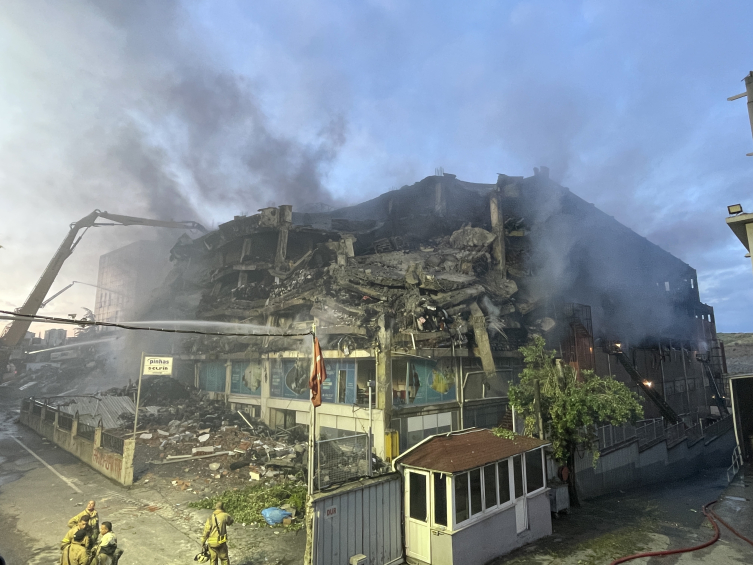 Binanın caddeye bakan bölümünde iş makineleriyle en üst kattan zemine kadar devam eden yıkım çalışmaları tamamlandı. Moloz yığınlarının binanın ön tarafında büyük yer kapladığı görüldü.