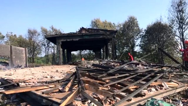 Uçak yardımıyla söndürülen yangının ardından fabrika küle döndü.