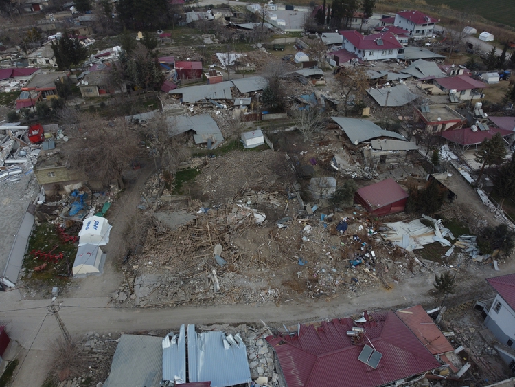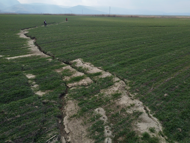 Öte yandan köyden geçen ve araziyi ikiye bölen fay kırığı da havadan görüntülendi.