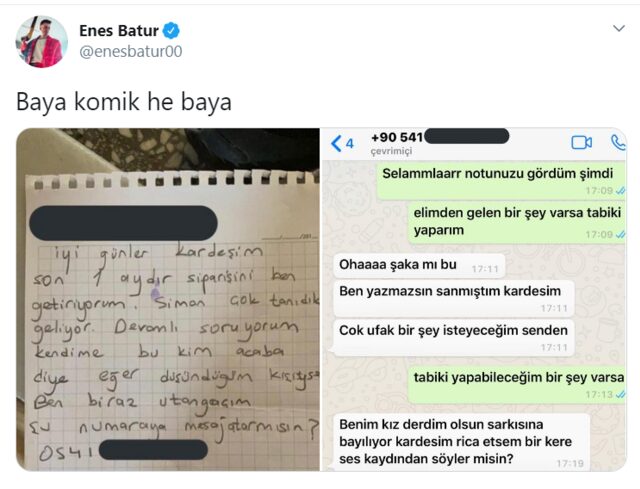 Sosyal medya fenomeni Enes Batur siparişlerini getiren kuryenin kendisine bıraktığı notu ve aralarında geçen diyalogları sosyal medya hesabından, “Bayağı komik bayağı” notuyla paylaştı. Kuryenin notunda, “İyi günler kardeşim. Son 1 aydır siparişini ben getiriyorum. Siman çok tanıdık geliyor. Devamlı soruyorum kendime ‘bu kim acaba’ diye. Ben biraz utangacım, düşündüğüm kişiysen şu numaraya mesaj atar mısın?” ifadeleri yer alıyordu. Enes Batur’un mesaj atması üzerine hayranlarının verdiği cevap fenomeni sinirlendirdi.