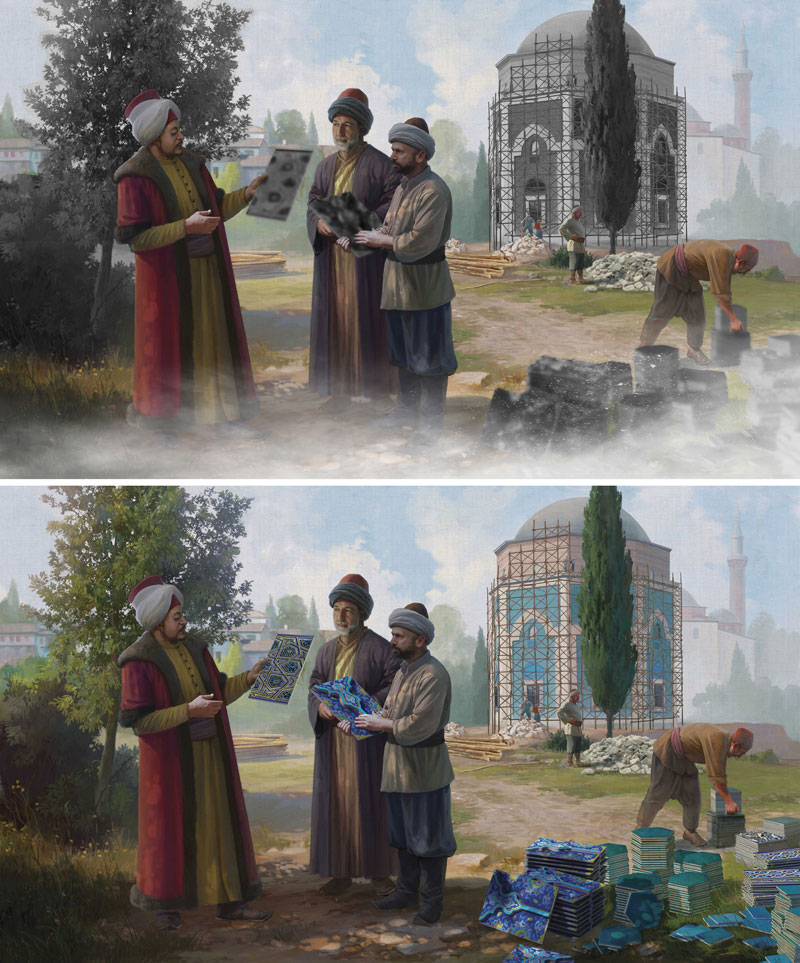 Müzenin kronolojik sergi alanında bulunan İvaz Paşa’nın Yeşil Türbe’de çini ustalarıyla sohbetini gösteren görselde, tarihi miras objeleri siyah beyaza çevrilerek gelecekte yaşanacak sorunlar anlatıldı.
