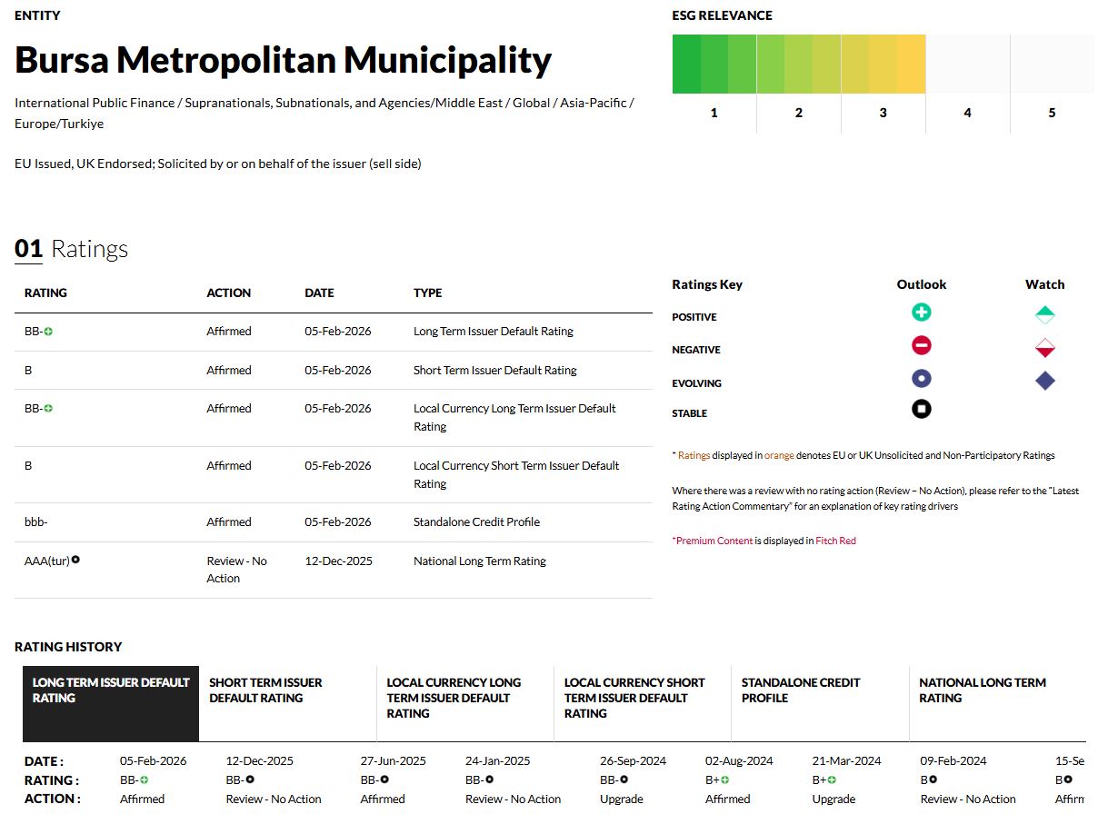 Fitch tarafından yapılan açıklamada, Bursa Büyükşehir Belediyesi’nin not görünümünün ‘stabil’den ‘pozitif’e çıkarıldığı, kredi notunun ise ‘BB-’ olarak korunduğu bildirildi.