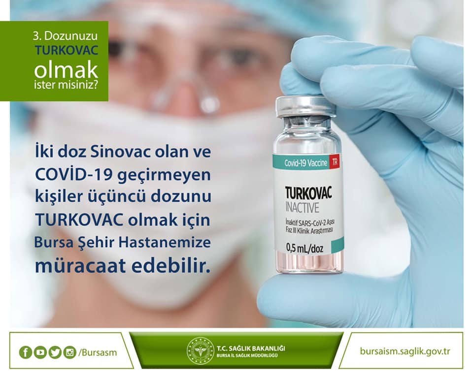 “Değerli Bursalılar; ilk yerli aşımız Turkovac için gönüllü olmak isteyen vatandaşlarımızı e- nabız üzerinden randevu alarak Bursa Şehir Hastanemize bekliyoruz. 18-59 yaş aralığındaysanız, şu ana kadar Covid-19 hastalığını geçirmediyseniz, 2 doz Sinovac aşınızı yaptırdıysanız ve 2. Doz aşınızın üzerinden en az 3 ay en fazla 9 ay geçtiyse; siz de Turkovac gönüllüsü olabilirsiniz”.