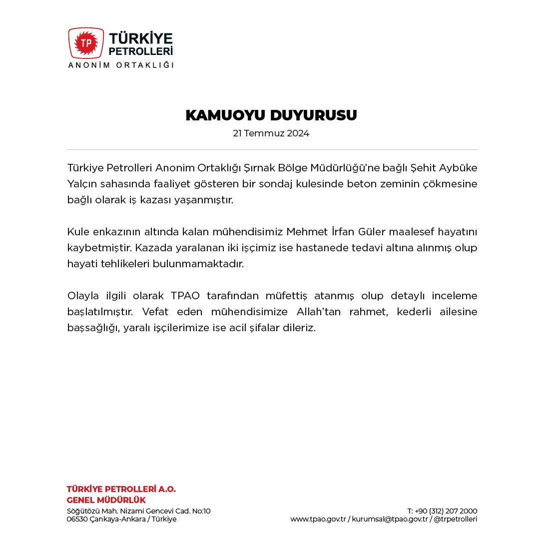Valilik, sosyal medya hesabından “Türkiye Petrolleri Anonim Ortaklığı Şırnak Bölge Müdürlüğü’ne bağlı ŞAY sahasında faaliyet gösteren bir sondaj kulesinde beton zeminin çökmesine bağlı olarak iş kazası yaşanmıştır. Kule enkazının altında kalan sondaj işçisi Furkan Tatar kazadan hemen sonra kurtarılarak helikopter ile hastaneye sevk edilmiştir. Kazada bir mühendis hayatını kaybetmiştir. Kazadan hafif yaralı olarak kurtulan bir işçi de Cizre Devlet Hastanesine sevk edilmiştir. Olayla ilgili incelemeler başlatılmıştır. Vefat eden mühendisimize Allah’tan rahmet, ailesine sabır ve başsağlığı, yaralılarımıza da acil şifalar diliyoruz.” açıklamasında bulundu.