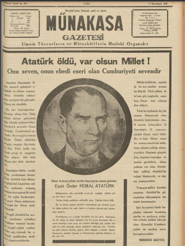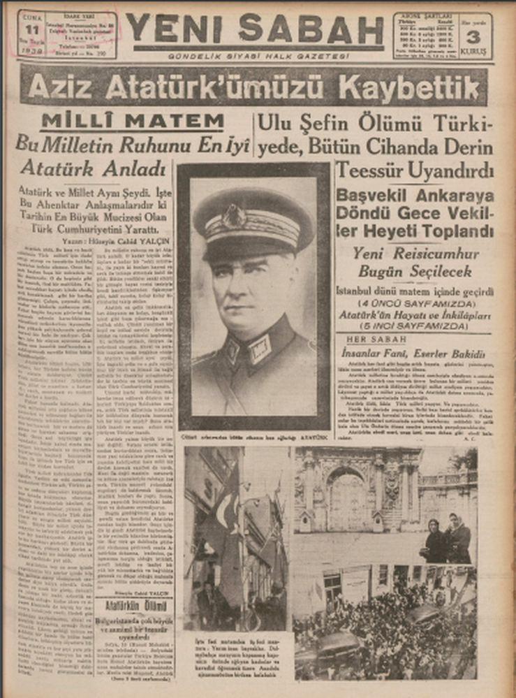 - Atatürk’ün ebediyete irtihalini, Ulus Gazetesi, “Kurtarıcını ve En Büyük Evladını Kaybettin. Türk Milleti, Sen Sağol”, Tan Gazetesi, “Babamızı Kaybettik”, Cumhuriyet Gazetesi, “Atatürkümüzü Kaybettik”, Kurun Gazetesi: “Atatürk Öldü. Türk Milleti Sen Sağol”, Son Posta Gazetesi: “Türk Milleti Ulu Şefini, İnsanlık Büyük Evladını Kaybetti” manşetleriyle haberleştirdi.