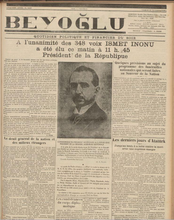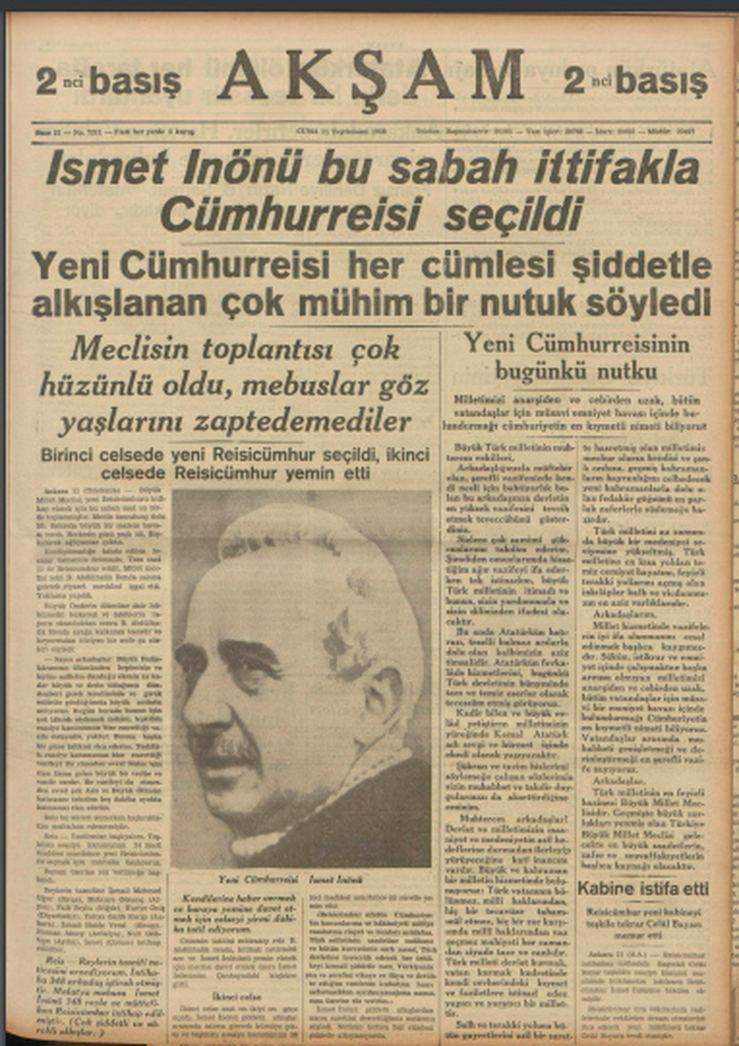 - Akşam gazetesi: İsmet İnönü bu sabah ittifakla Cümhurreisi seçildi. Yeni Cümhurreisi her cümlesi şiddetle alkışlanan çok mühim bir nutuk söyledi.