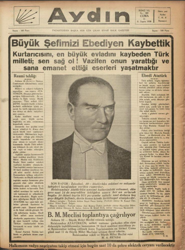 - Aydın gazetesi: Büyük şefimizi ebediyen kaybettik! Kurtarıcısını en büyük evladını kaybeden Türk milleti; sen sağ ol! Vazife onun yarattığı ve sana emanet ettiği eserleri yaşatmaktır.