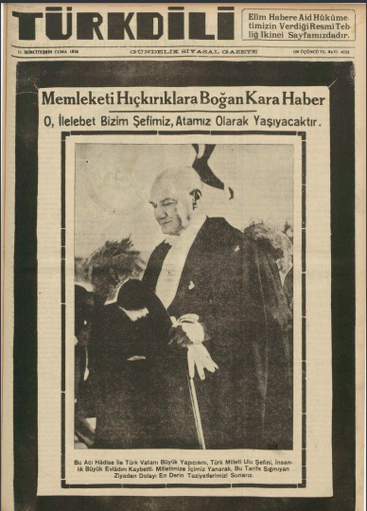 - Türkiye Cumhuriyeti’nin kurucusu Büyük Önder Mustafa Kemal Atatürk’ün 10 Kasım 1938’de ebediyete irtihalini, gazeteler yıldırım baskılarla halka duyurdu, büyük acı, duygu yüklü sözlerle manşetlerine taşındı.