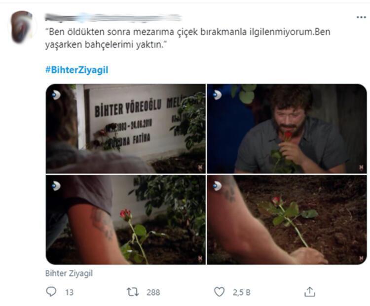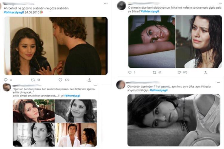 - “Ah Behlül ne gözünü alabildin ne göze alabildin #bihterziyagil 24.06.2010” “O ölmesin diye beni öldürüyorsun. Nihal tek nefeste sönüverecek çiçek; peki ya Bihter?’#bihterziyagil” “Eğer sen beni tanıyorsan, ben kendimi tanıyorsam, ben Bihter’sem eğer bu evlilik olmayacak…’ Evlilik olmadı ama Bihter canından oldu…11 yıl #bihterziyagil” “Ölümünün üzerinden 11 yıl geçmiş.. aynı hırs, aynı öfke ,aynı ihtirasla anıyoruz kraliçeyi. #bihterziyagil”