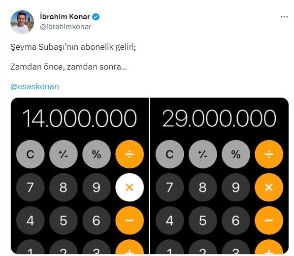 - Kanal D muhabiri İbrahim Konar, Şeyma Subaşı’nın 1 ayda kazandığı parayı açıkladı. Zamdan önce 14 milyon kazanan Subaşı, zamdan sonra 29 milyon kazandı.(tv100)