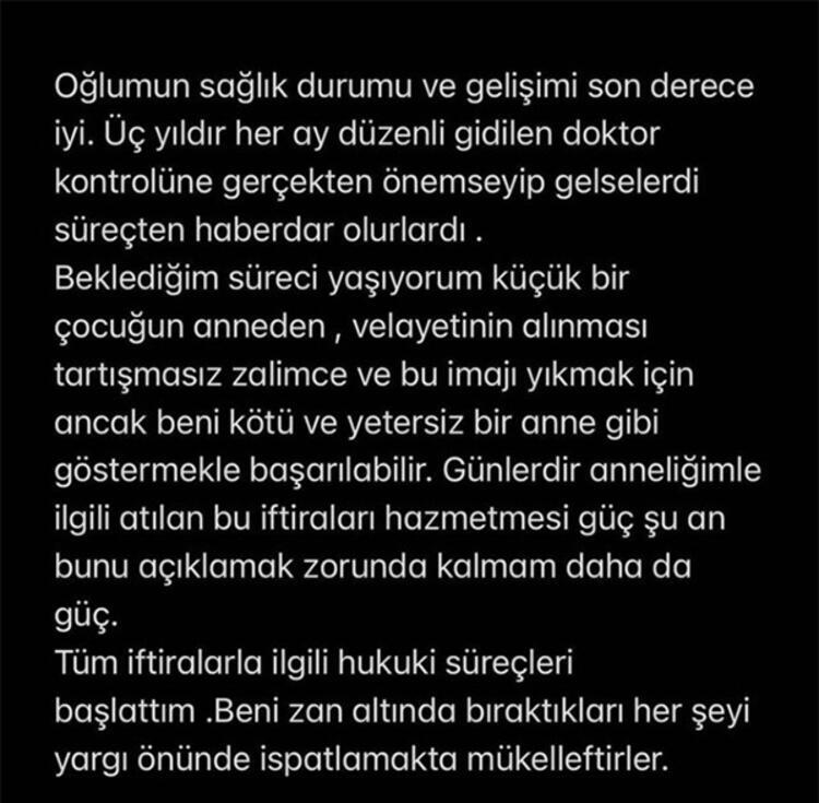 - FEYZA AKTAN: HUKUKİ SÜREÇLERİ BAŞLATTIM… Aktan, “Oğlumun sağlık durumu ve gelişimi son derece iyi. Üç yıldır her ay düzenli gidilen doktor kontrolüne gerçekten önemseyip, gelselerdi süreçten haberdar olurlardı. Beklediğim süreci yaşıyorum. Küçük bir çocuğun anneden velayetinin alınması tartışmasız zalimce ve bu imajı yıkmak için ancak beni kötü ve yetersiz bir anne gibi göstermekle başarabilirler” dedi.