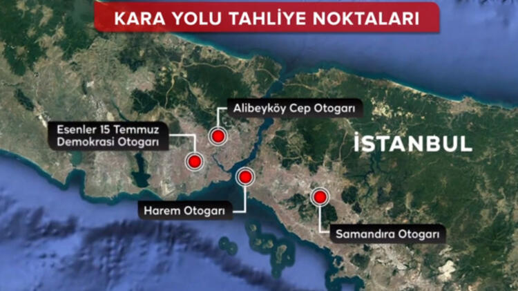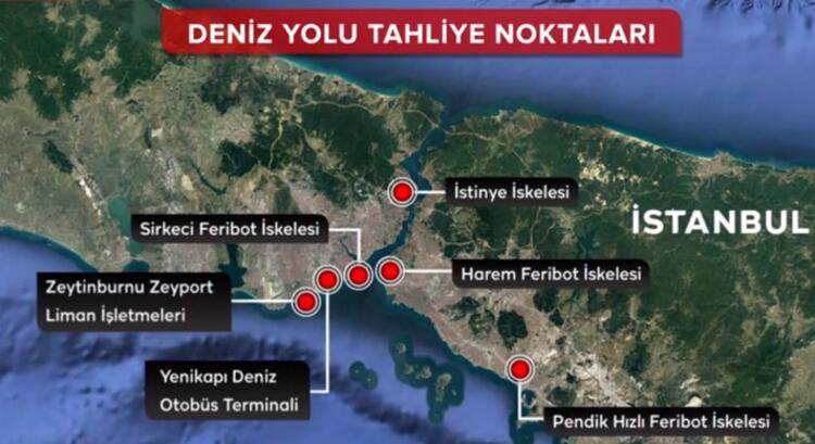 - DENİZDEN YAPILACAK TAHLİYE NOKTALARI… Denizden yapılacak tahliyeler için 6 nokta belirlendi. Vatandaşlar araçlarla bu noktalara taşınacak, ardından gemilerle İstanbul dışına çıkarılacak. Adalar için de iskele ve 5 kapak atma alanı belirlendi. Bunlar, Sirkeci Feribot İskelesi, Yenikapı Deniz Otobüs Terminali, Pendik Hızlı Feribot İskelesi, İstinye İskelesi, Harem Feribot İskelesi ve Zeytinburnu Zeyport Liman İşletmeleri.