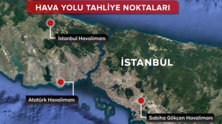 - KARA YOLU TAHLİYE NOKTALARI… Tahliye sürecinde karayolları da önemli bir rol oynayacak. Esenler, Alibeyköy, Samandıra ve Harem Otogarları deprem sonrası için acil çıkış terminalleri olacak. Tüm ayrıntıların düşünüldüğü deprem eylem planında, hava yolu da tahliye için kullanılacak. Bunlar, İstanbul Havalimanı, Atatürk Havalimanı ve Sabiha Gökçen Havalimanı olacak.
