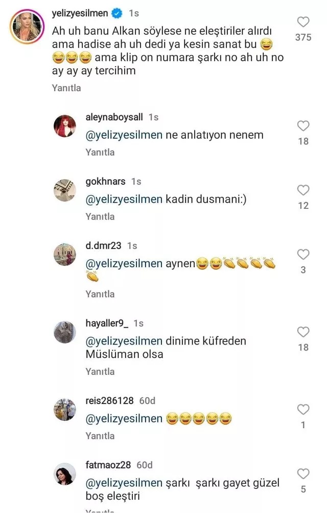 - “BANU ALKAN SÖYLESE NE ELEŞTİRİLER ALIRDI” Yeliz Yeşilmen, Hadise ve Murda’nın cesur sahneler içeren klibi için kayıtsız kalamadı. Ünlü isim ikilinin klibi için, “Ah uh Banu Alkan söylese ne eleştiriler alırdı ama Hadise ah uh dedi ya kesin sanat bu ama klip on numara şarkı no. Ah uh no ay ay ay tercihim” yorumunu yaptı.