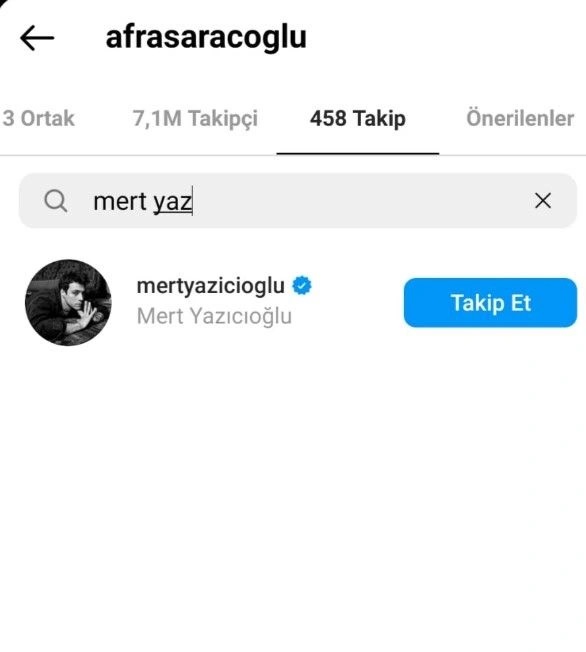 - Önceki akşam sevgilisi Dilan Çiçek Deniz ile bir mekan çıkışı görüntülenen ve mutluluğu gözlerden kaçmayan Mert Yazıcıoğlu, 4 yıl aşk yaşadığı Afra Saraçoğlu’nu Instagram’da takipten çıkardı.