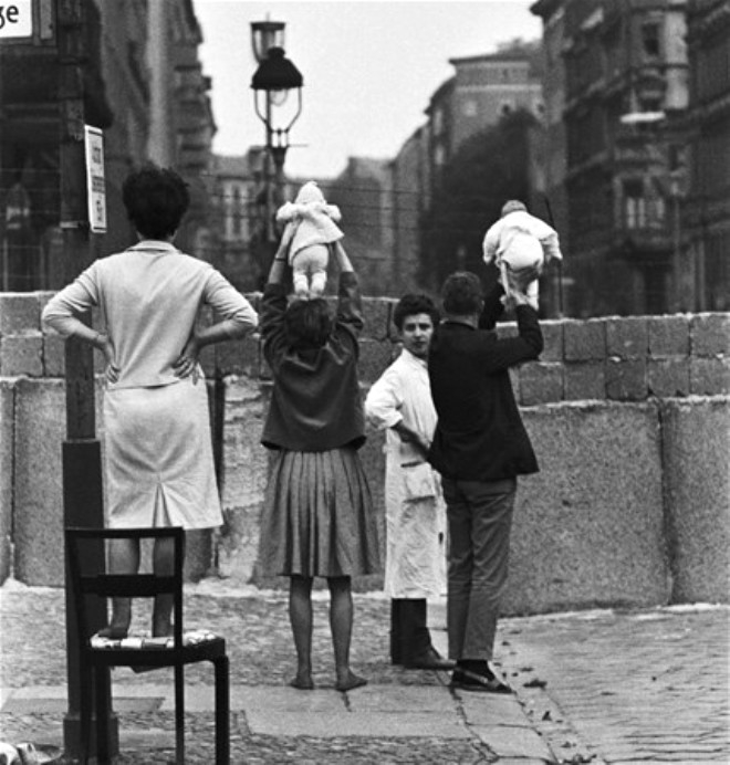 Berlin Duvarı’nın diğer tarafında kalan akrabalarına göstermek için bebeklerini yukarıya kaldıran çift, 1961
