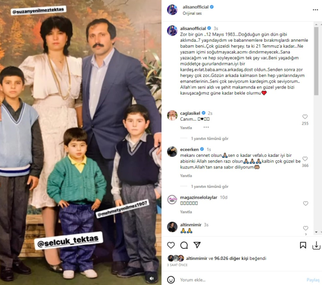 - “NE YAZSAM İÇİMİ SOĞUTMAYACAK” Instagram hesabından ailesiyle çektirdiği fotoğrafları slayt yaparak yayınlayan Alişan, “Zor bir gün… 12 Mayıs 1983…Doğduğun gün dün gibi aklımda. 7 yaşındaydım ve babaannemlere bırakmışlardı annemle babam beni. Çok güzeldi her şey, ta ki 21 Temmuz’a kadar… Ne yazsam içimi soğutmayacak, acımı dindirmeyecek. Sana yazacağım ve hep söyleyeceğim tek şey var. Beni yaşadığım müddetçe gururlandırman, iyi bir kardeş, evlat, baba, amca, arkadaş, dost oldun. Senden sonra zor her şey çok zor. Gözün arkada kalmasın ben hep yanlarındayım emanetlerinin. Seni çok seviyorum kardeşim, çok seviyorum. Allah’ım seni aldı ve şehit makamında en güzel yerde bizi kavuşacağımız güne kadar bekle olur mu” ifadelerini kullandı.