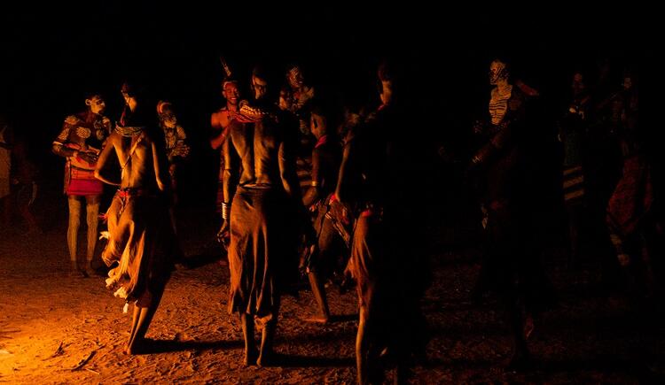 - Tören esnasında 10-30 arasında büyükbaş hayvan kesilir. Ve hayvanın dışkısıyla hazırladıkları karışımı vücutlarına sürerek dans ederler. Çünkü kabilede hayvan dışkısı büyük önem arz eder.