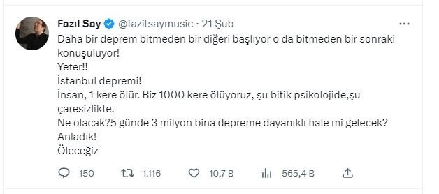 - Fazıl Say Twitter hesabından şu sözler söyledi: Daha bir deprem bitmeden bir diğeri başlıyor o da bitmeden bir sonraki konuşuluyor! Yeter! İstanbul depremi! İnsan, 1 kere ölür. Biz 1000 kere ölüyoruz, şu bitik psikolojide, şu çaresizlikte. Ne olacak? 5 günde 3 milyon bina depreme dayanıklı hale mi gelecek? Anladık! Öleceğiz.(tv100)